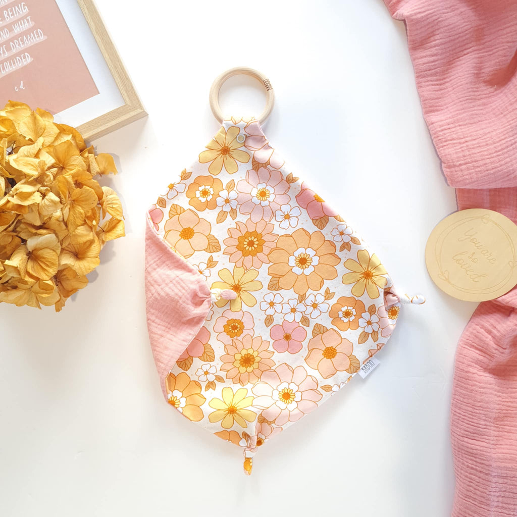 Our doudou* is made of one side soft organic jersey cotton (with 5% spandex) and one side natural double gauze, with an attached untreated beech wood teether!