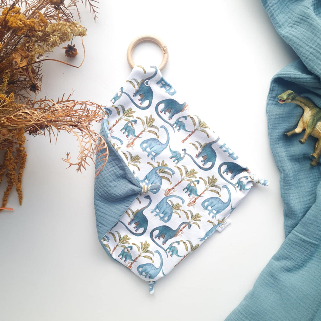 Our doudou* is made of one side soft organic jersey cotton (with 5% spandex) and one side natural double gauze, with an attached untreated beech wood teether!