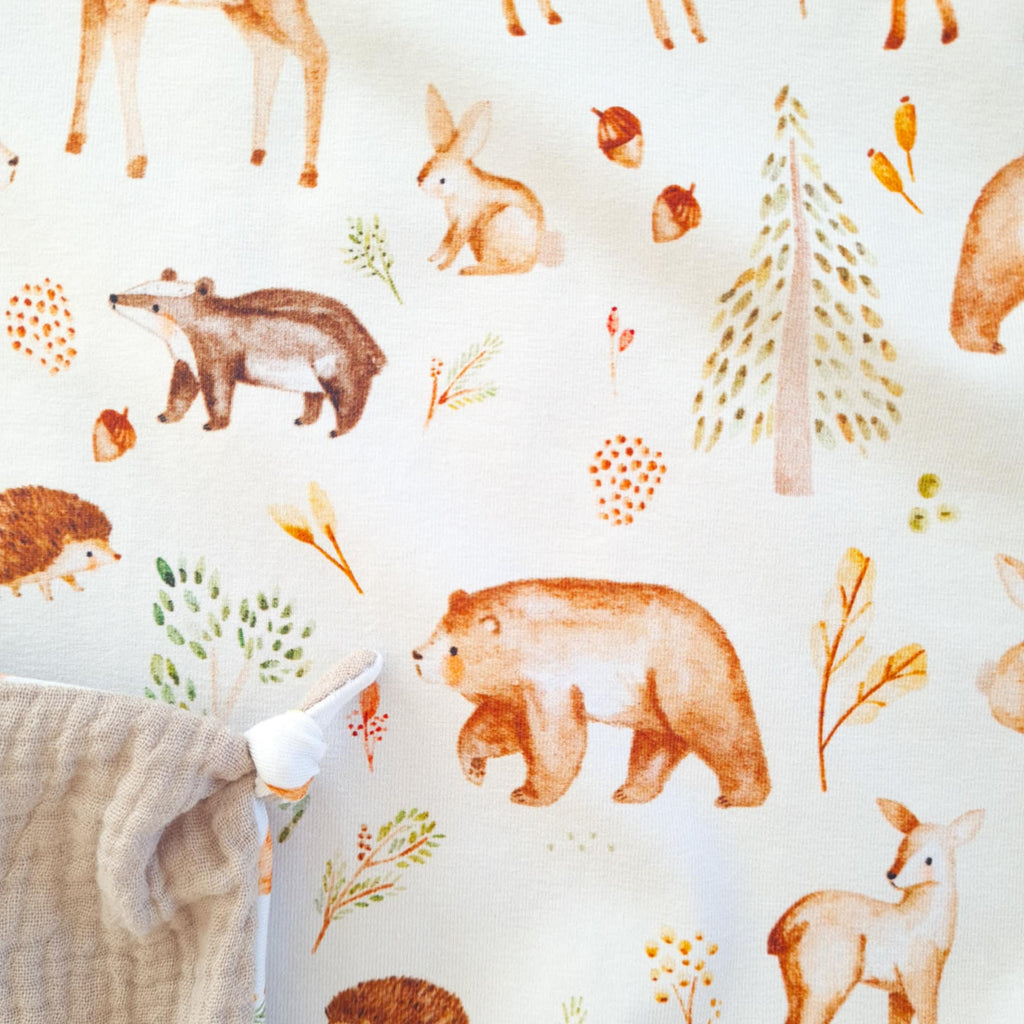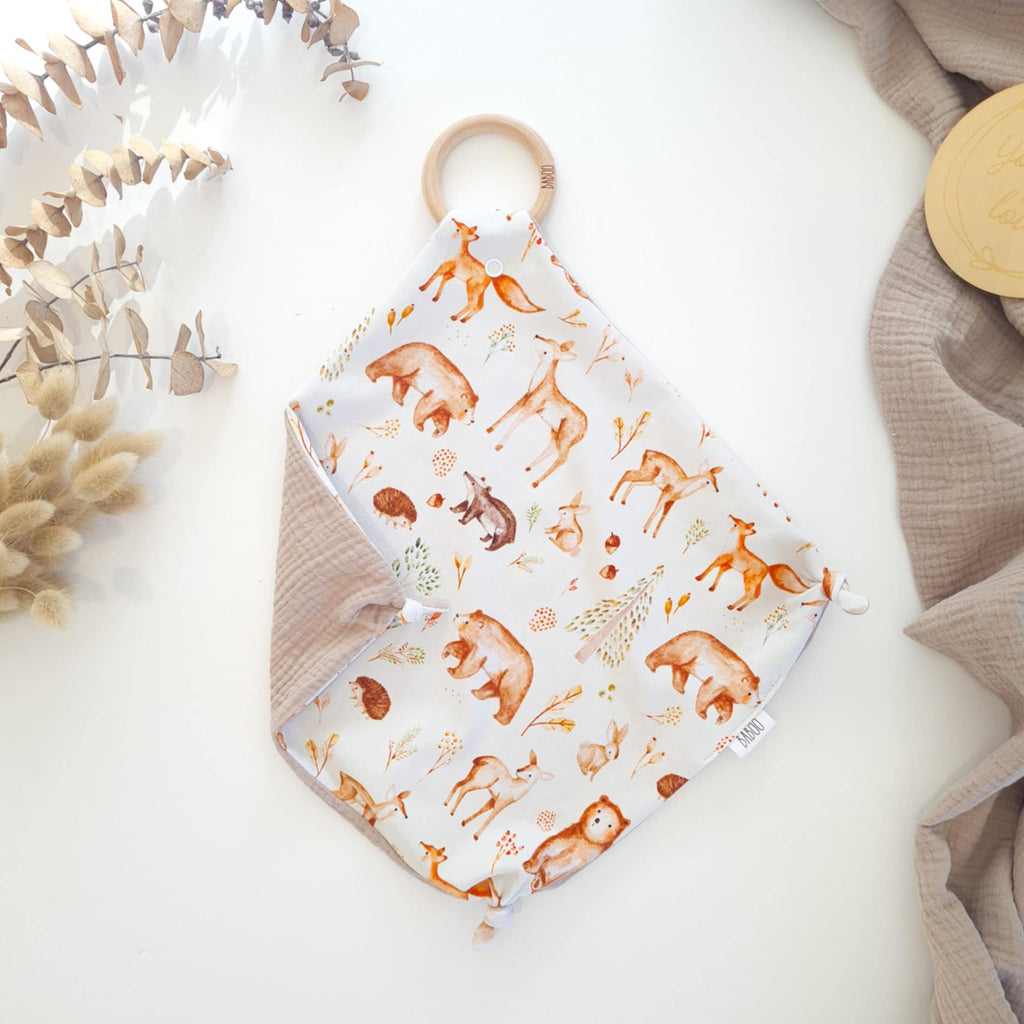 Our doudou* is made of one side soft organic jersey cotton (with 5% spandex) and one side natural double gauze, with an attached untreated beech wood teether!