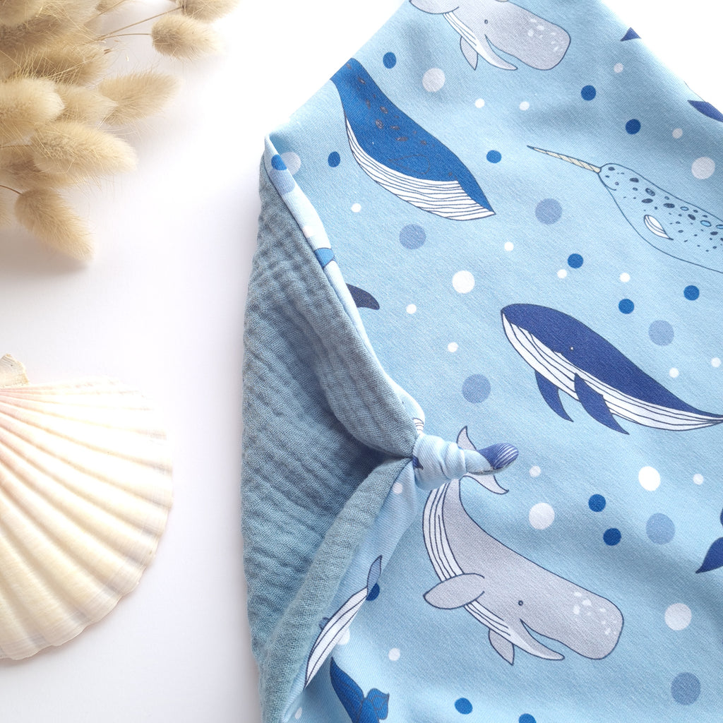 Our doudou* is made of one side soft organic jersey cotton (with 5% spandex) and one side natural double gauze, with an attached untreated beech wood teether!