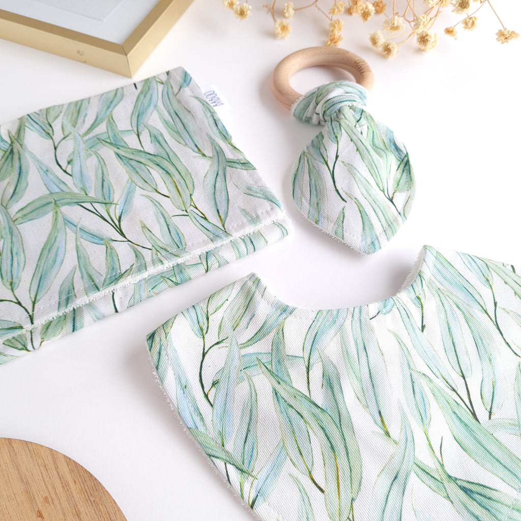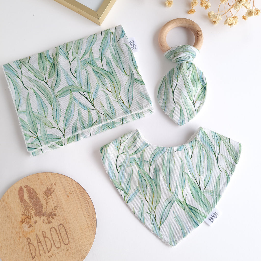 Includes a matching dribble bib, a teether and a burp cloth comes beautifully packaged